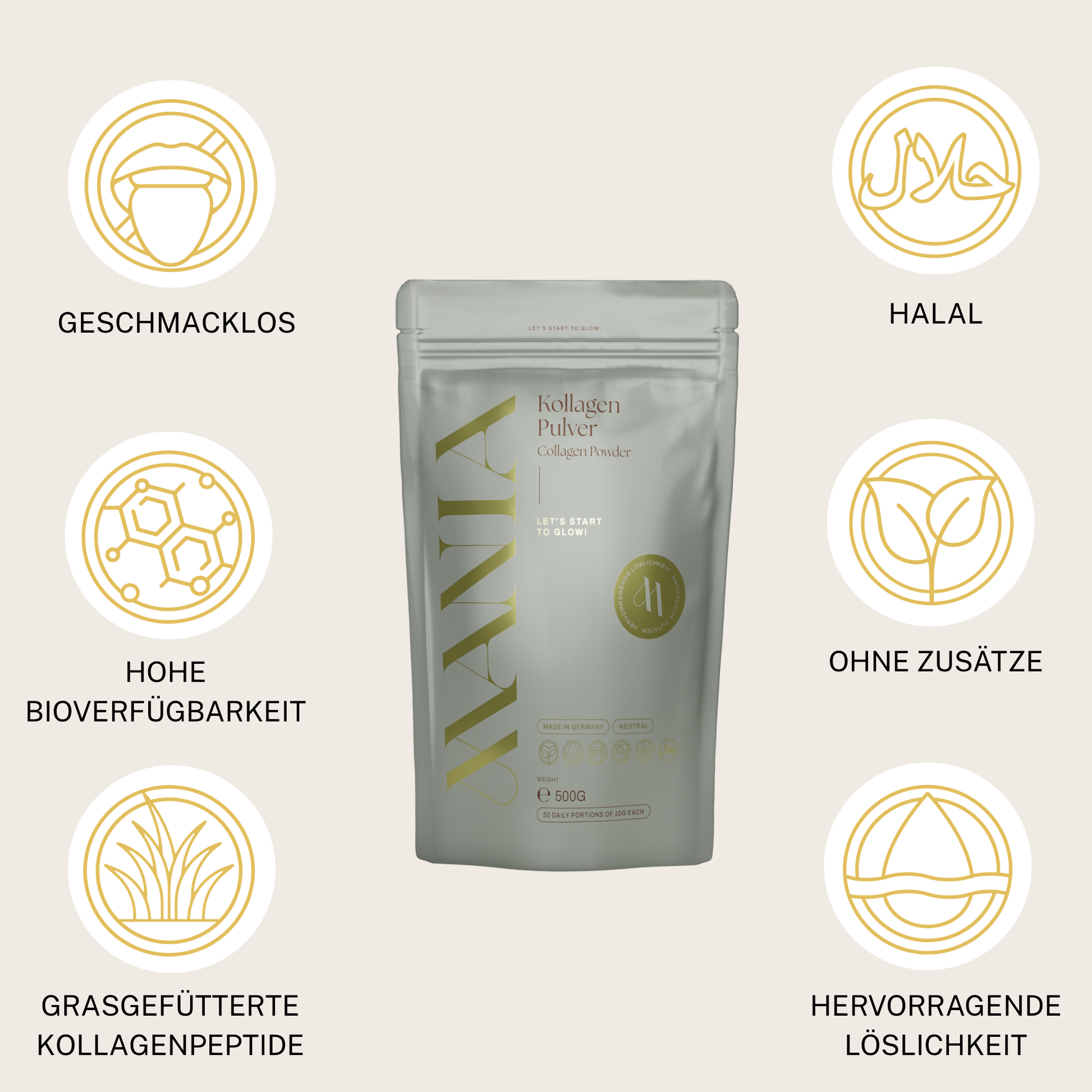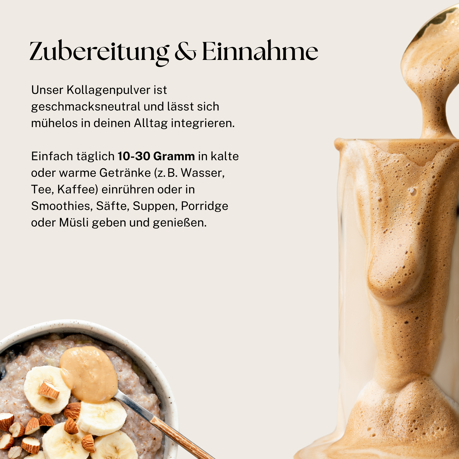 Unser Kollagenpulver vom Typ I & III ist geschmacksneutral und hitzebeständig, ideal für Kaffee, Tee, Smoothies oder warme Speisen. Dadurch lässt es sich mühelos in deine tägliche Routine integrieren, ganz ohne Kompromisse im Geschmack oder in der Anwendung.