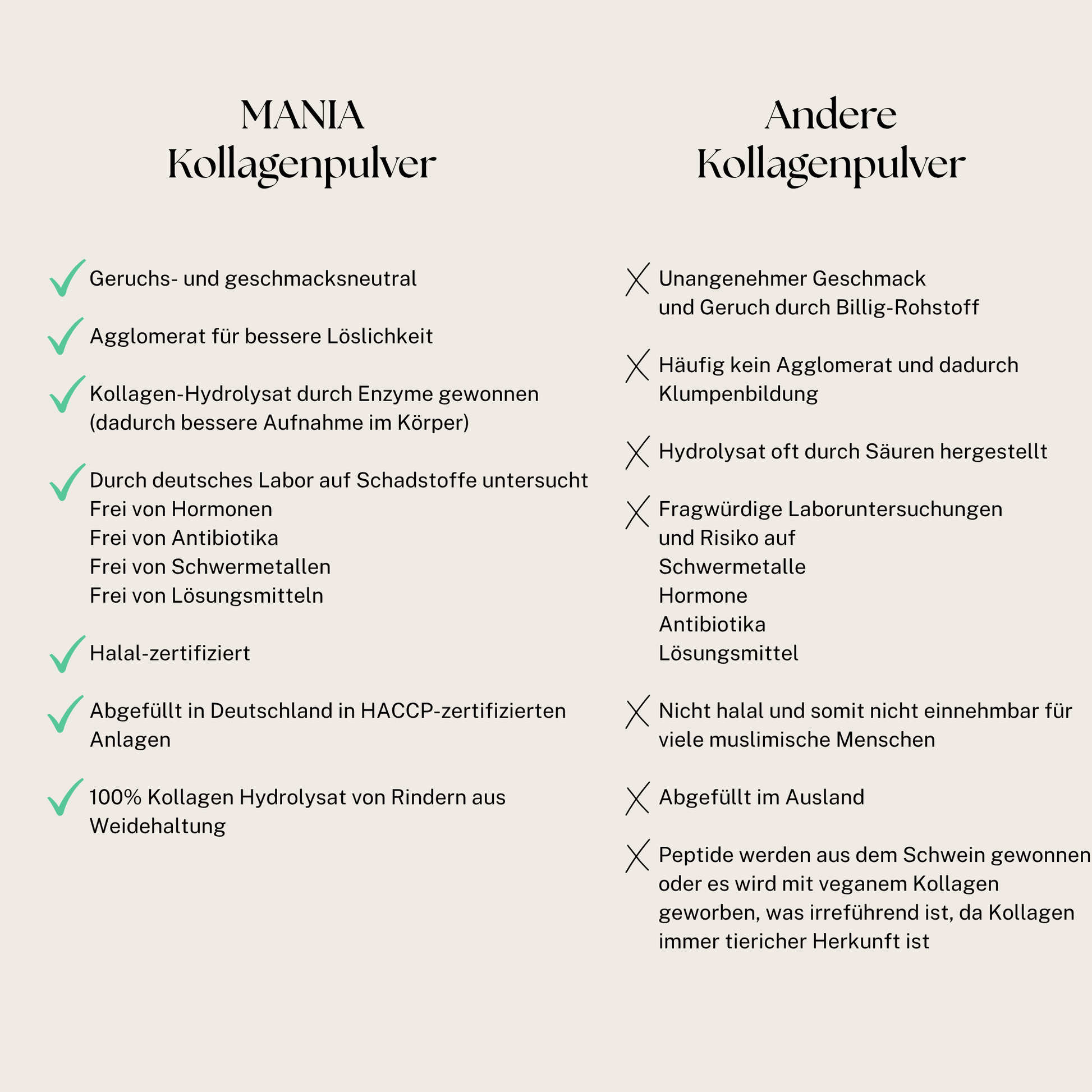 Unser Kollagen stammt ausschließlich von Rindern aus Weidehaltung und ist grass fed-zertifiziert. Wir legen großen Wert auf eine verantwortungsvolle Herkunft der Rohstoffe, mit Fokus auf Tierwohl, artgerechte Haltung und nachhaltige Landwirtschaft.